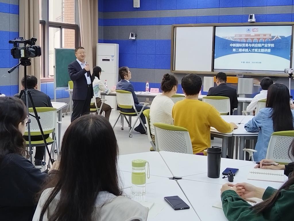 2024年10月24日,我校中新国际贸易与供应链产业学院(下称产业学院)第二期卓越人才班主题讲座在1220智慧教室顺利举行。讲座由新加坡企业发展局(下称新加坡企发局)中国司华西区商务经理胡晨与重庆市商务委中新物流航空处副处长郑弦主讲。新加坡企发局中国区副司长叶栢安,中新互联互通(重庆)物流发展有限公司企业导师代表,我校校长吴华安、云顶7610线路检测院长刘岱、副院长陈郑霖,卓越人才班导师团队和全体学员参加讲座。