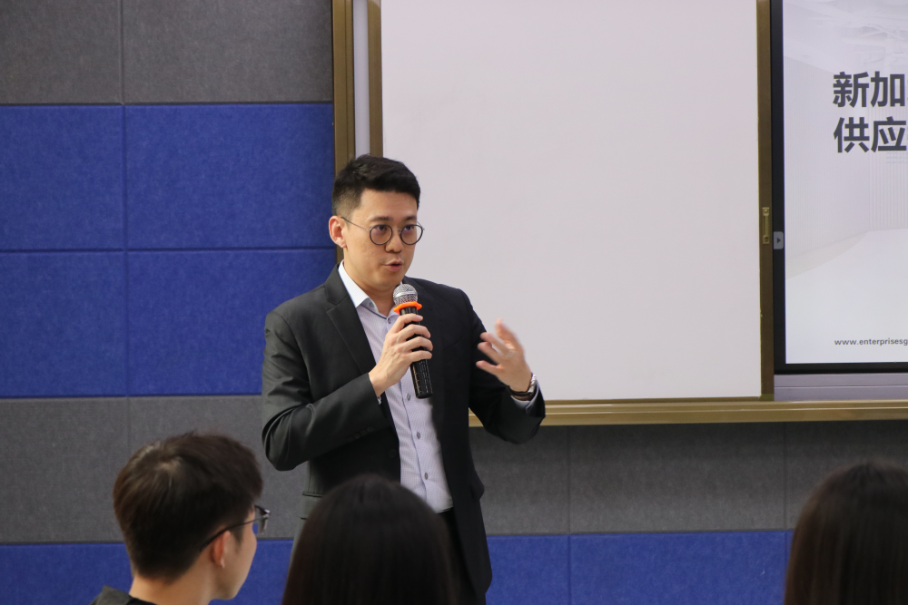 胡晨经理以“新加坡国际贸易与供应链发展”为主题,详细阐述了新加坡如何利用其独特的地理优势、金融贸易设施、多元化网络、高效物流系统以及稳定的法律政策环境,成功打造成为国际贸易中心和全球最佳转运枢纽。他的分享让学员们对新加坡的国际贸易与供应链体系有了更为全面和深入的了解。